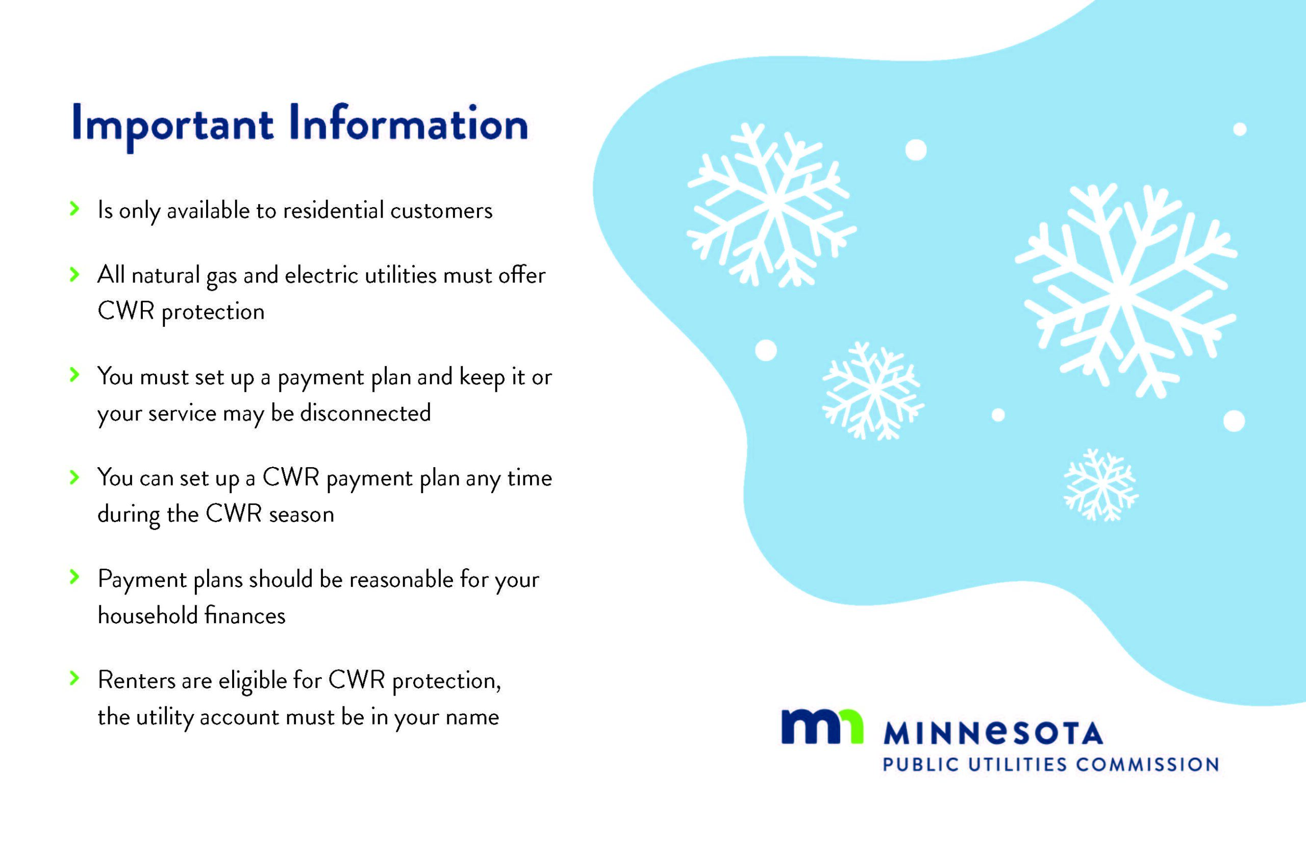 Shut-off ProtectionMinnesota’s Cold Weather Rule (CWR) is a state law that protects residential utility customers from having electric or natural gas service shut off between October 1 and April 30. To protect your service from disconnection you must make and keep a payment plan that you and your utility agree on. The utility must offer a payment plan that is reasonable for your household’s financial circumstances. You can set up a utility payment plan at any time throughout the year. You are eligible for CWR protection even if you rent – the electricity or gas must be the primary heat source and the utility account must be in your name. You and your utility must agree to a payment plan that is reasonable for your household. You can set up a utility payment plan at any time throughout the year. All natural gas and electric utilities must offer CWR protection. CWR does not apply to delivered fuels; oil and propane or wood. If you use delivered fuels, and your furnace is run by electricity, you should apply for CWR protection with your electric company. Call your natural gas, electric, municipal utility or electric cooperative for more information, or contact the Commission’s Consumer Affairs Office at consumer.puc@state.mn.us or 651-296-0406, 1-800-657-3782 |